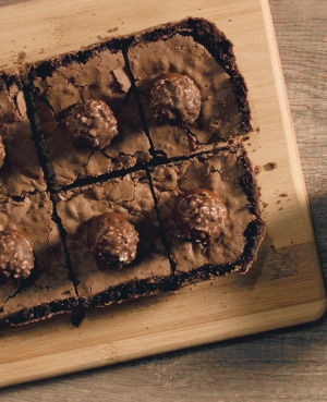 - Una vez frio cortar en cuadrados y con ayuda de una manga poner dulce de leche en cada porción. Finalizar con Ferrero Rocher.