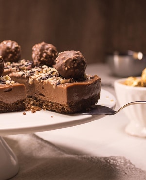 - Procesar Avellanas y Derretir chocolate para decorar. Decorar con Ferrero Rocher.