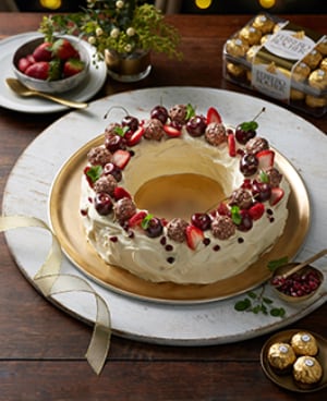 - Decorate the wreath with Ferrero Rocher, strawberries, cherries and pomegranate, then garnish with mint. Serve.