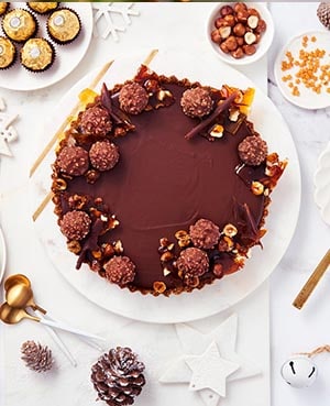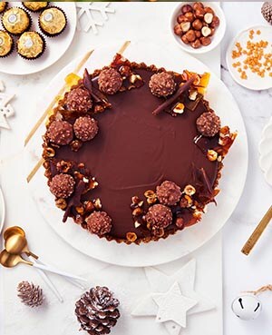 - Refrigerate for at least an hour uncovered, then decorate with Ferrero Rocher, chocolate curls and candied hazelnuts to taste.