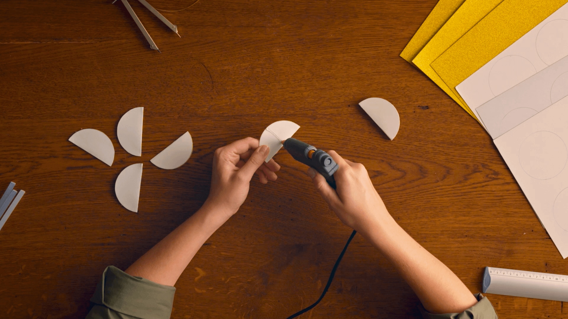 Use the compass to draw circles on the white side of the golden paper.