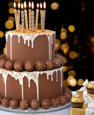 - Place the top layer on the base and finish decorating with Ferrero Rocher around the base of the cake.