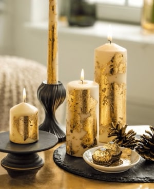 - Pour obtenir un effet vintage, frottez les bougies à certains endroits avec une brosse jusqu’à ce que la fine couche dorée se détache.