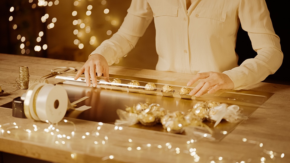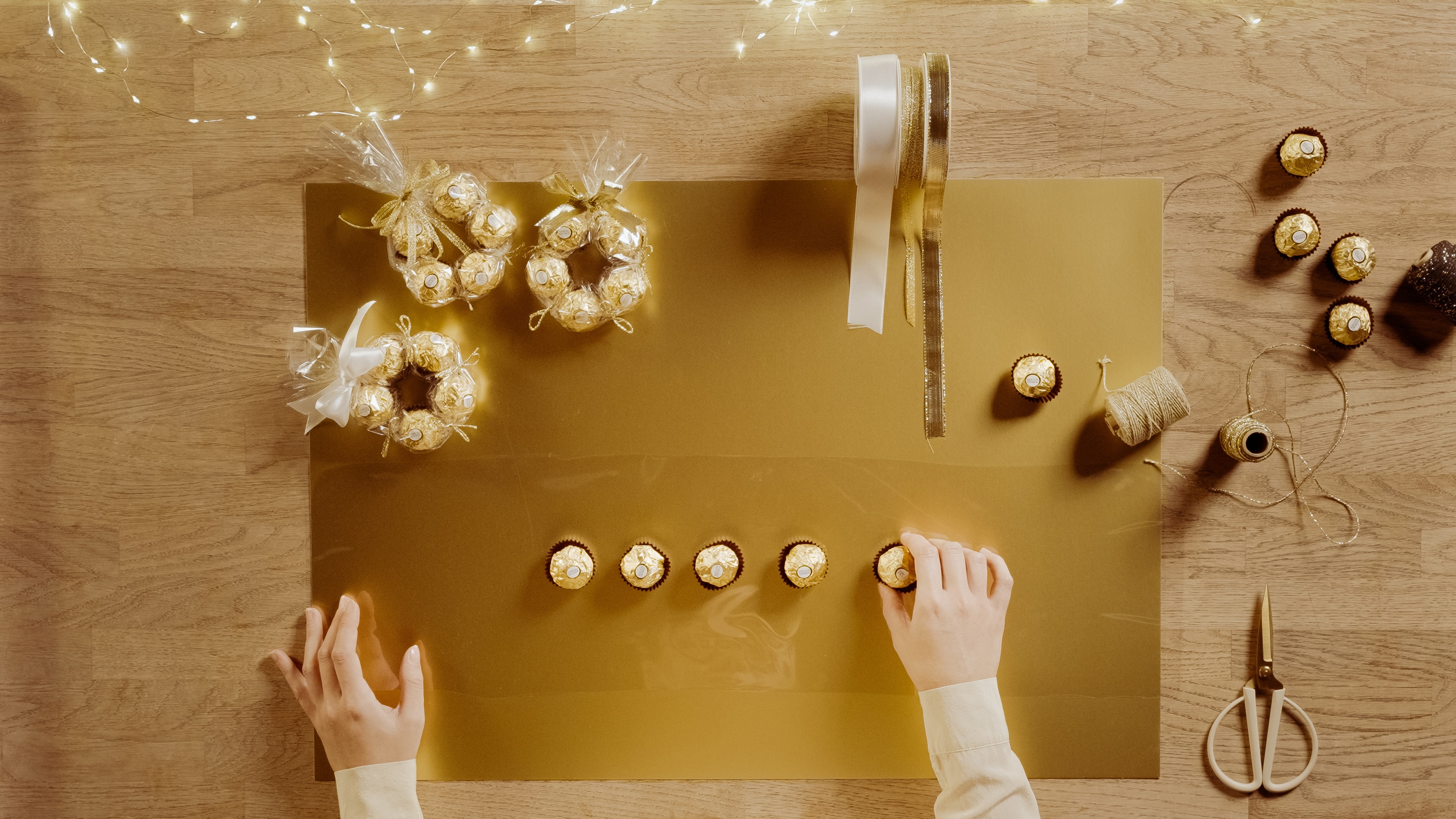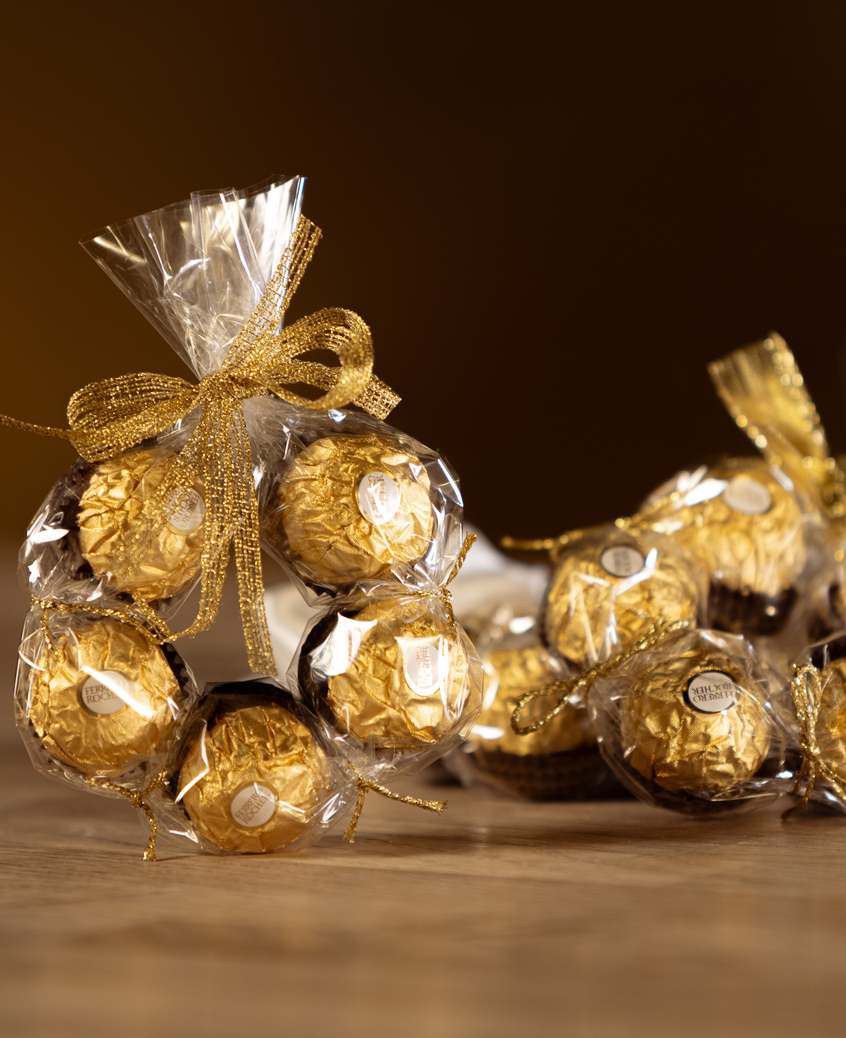 Placez 5 Ferrero Rocher horizontalement sur une bande de cellophane transparente.