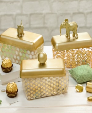 Besproei nu het deksel en het figuur met de gouden spuitverf. Laat de verf goed drogen; hoelang dit duurt kan variëren, maar wij raden aan 30 minuten te wachten.