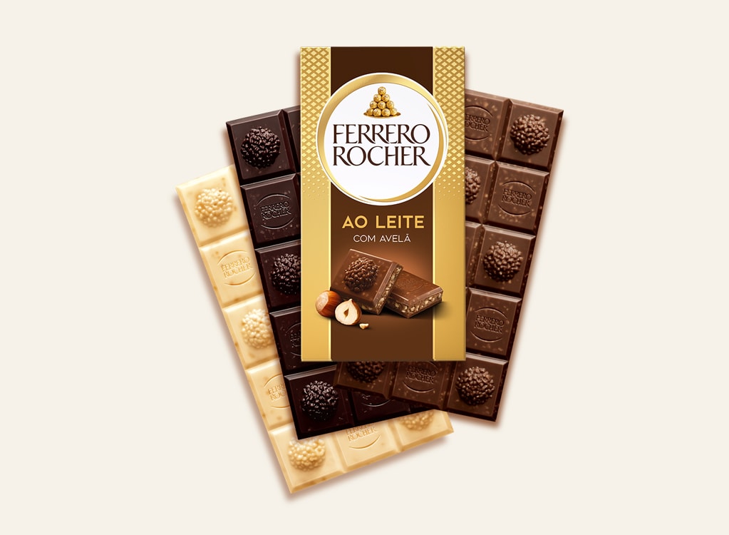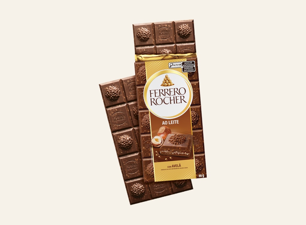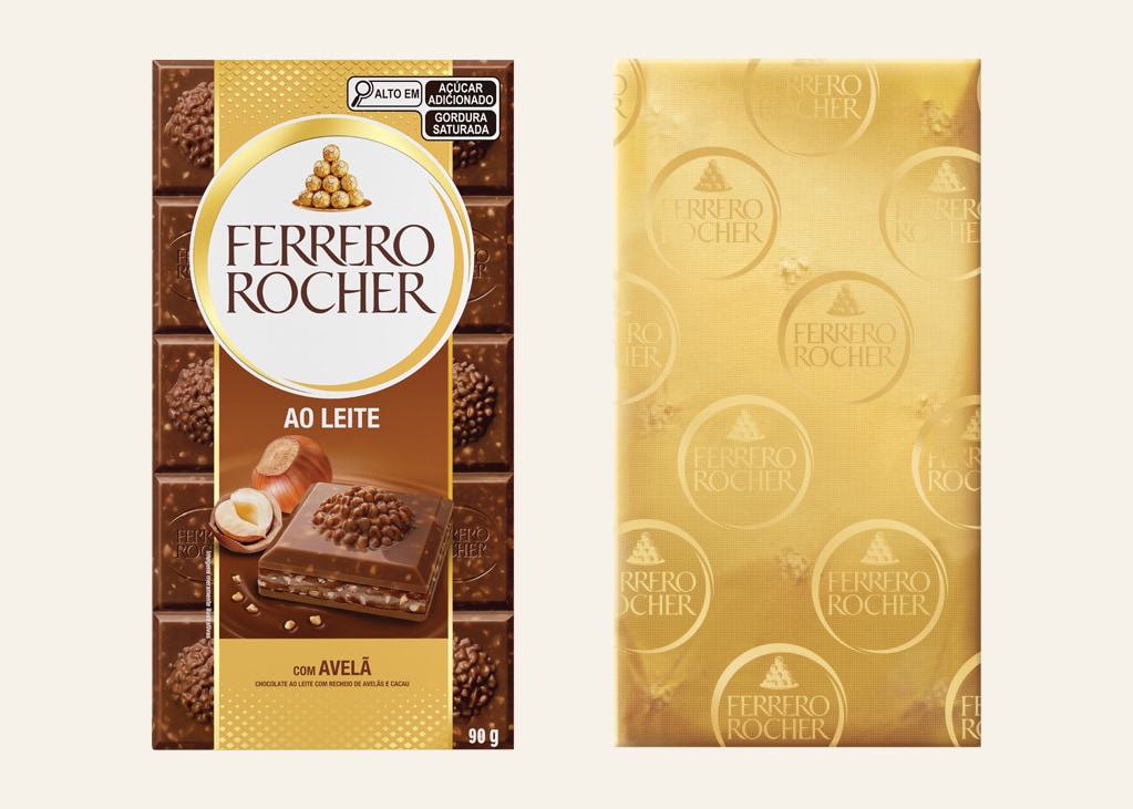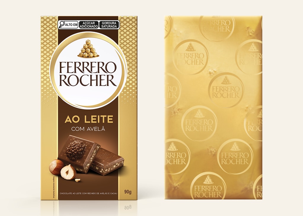Os tabletes de chocolate Ferrero são selados em uma folha de alumínio hermética dentro de uma caixa de papel para proteger o sabor e a qualidade do tablete.