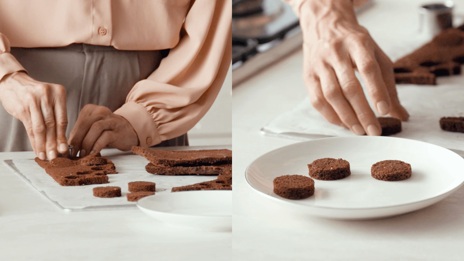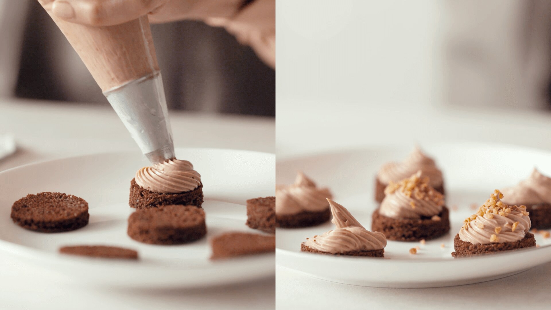 Pipe a little chocolate cream onto each of the cocoa sponge circles, sprinkle with crushed hazelnuts, and freeze.