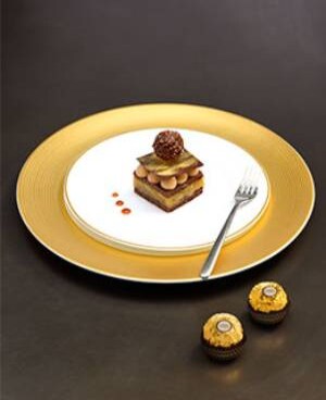 • Mit einem Schokoladenplättchen garnieren und mit Goldpuder bestreuen.