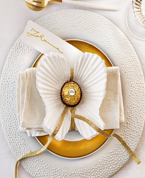 - Etikett zum himmlischen Tischgedeck hinzufügen und Ferrero Rocher als Willkommensgruß für die Gäste mittig auf den Engelsflügeln platzieren.