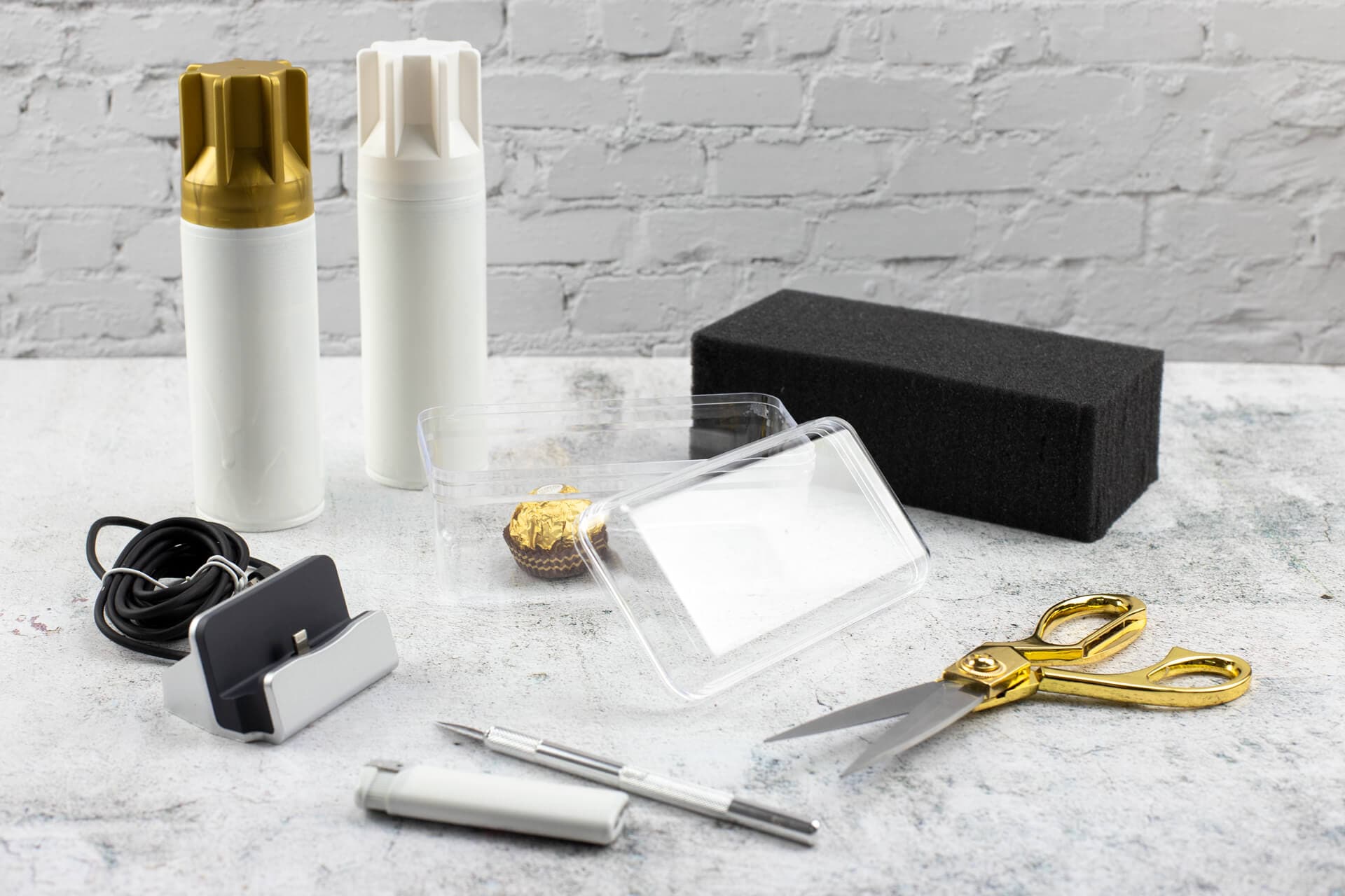 Schneiden Sie den Schaumgummi auf die Maße der Box zu (14cm Länge, 7,5cm Breite und 5cm Höhe). Schneiden Sie anschließend die Aussparung für den Handy-Ladesockel aus (5,5cm Länge, 7,5cm Breite und 6cm Tiefe).