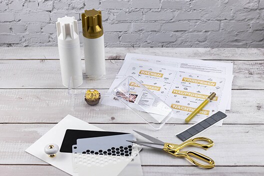 Wenn das Rezeptlabel getrocknet ist, können Sie es mit Hilfe von Klebemasse auf die Box kleben.