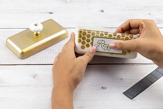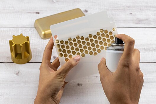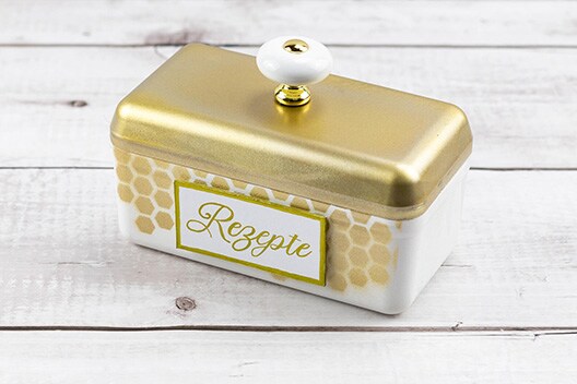 Sobald die Sprühfarbe getrocknet ist, nehmen Sie Ihre Schablone zur Hand und besprühen Sie die Vorder- und Hinterseite der Box mit goldener Sprühfarbe. Lassen Sie die Farbe wiederum für rund 20 Minuten trocknen.