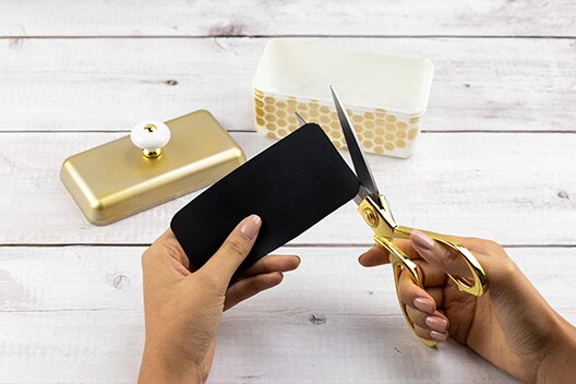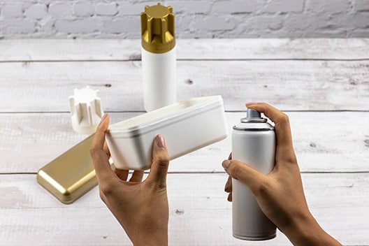 Grundieren Sie den unteren Teil der Box mit weißer Sprühfarbe und den Deckel mit goldener. Lassen Sie beide Teile für ca. 20 Minuten gut trocknen.