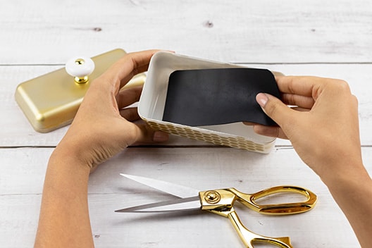 Nehmen Sie ein Stück weiße Pappe, schneiden Sie es so zu, dass es gut auf die lange Seite der Box passt und verzieren Sie es mit einem Goldstift.