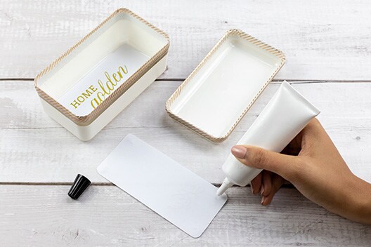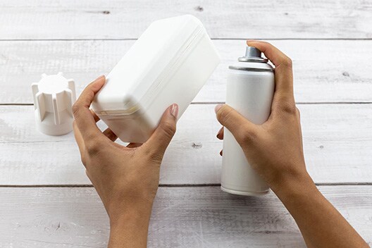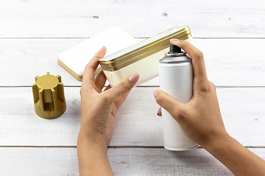 Grundieren Sie beide Teile der Box mit weißer Sprühfarbe. Lassen Sie die Box anschließend für ca. 20 Minuten gut trocknen.