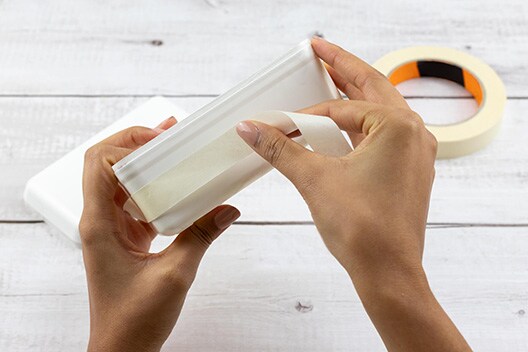 Um die Box zu verzieren, kleben Sie beide Teile der Box an den unteren Seiten mit Kreppband ab.