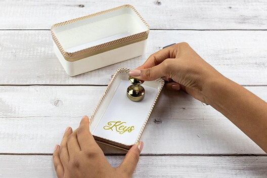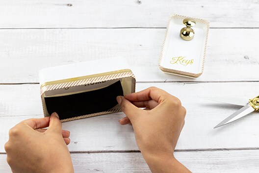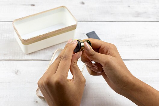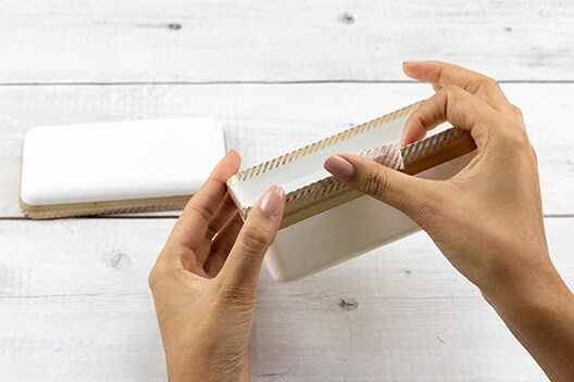 Sobald die Farbe getrocknet ist, ziehen Sie das Kreppband ab und bekleben Sie die Kanten mit Washi-Tape, um die Kanten der Box abzurunden.