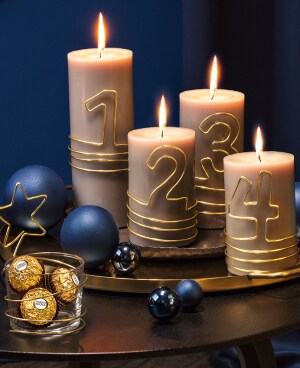 - Adventskerzen gemeinsam mit dem Pralinenglas auf dem goldenen Tablett arrangieren.