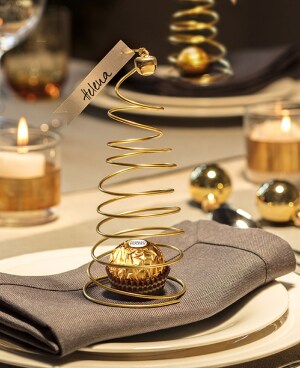 - Ferrero Rocher für jeden Gast auf einer Serviette platzieren und das goldene Bäumchen wie eine Haube daraufsetzen.
