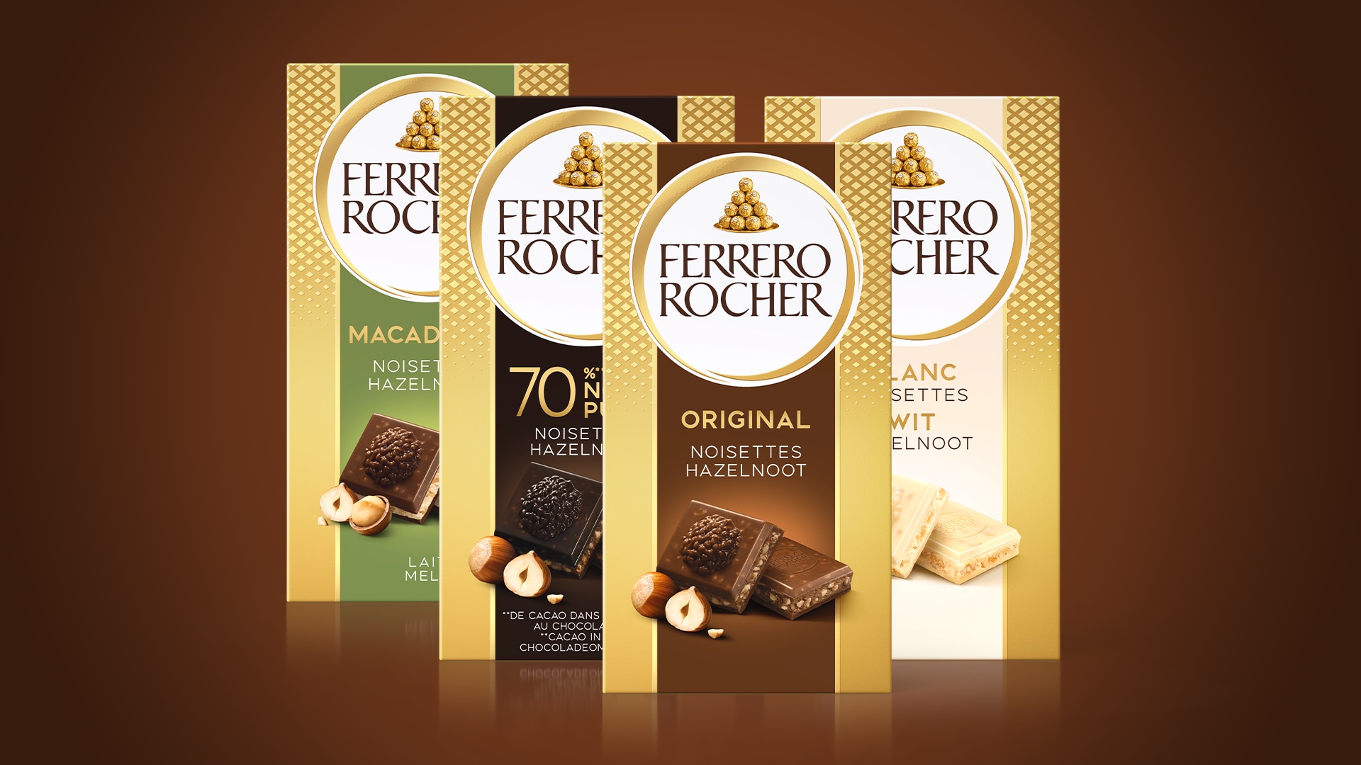 Découvrez le nouveau design de nos tablettes Ferrero Rocher et laissez-vous transporter par nos deux nouvelles saveurs chocolat noir 70% et chocolat au lait saveur macadamia.