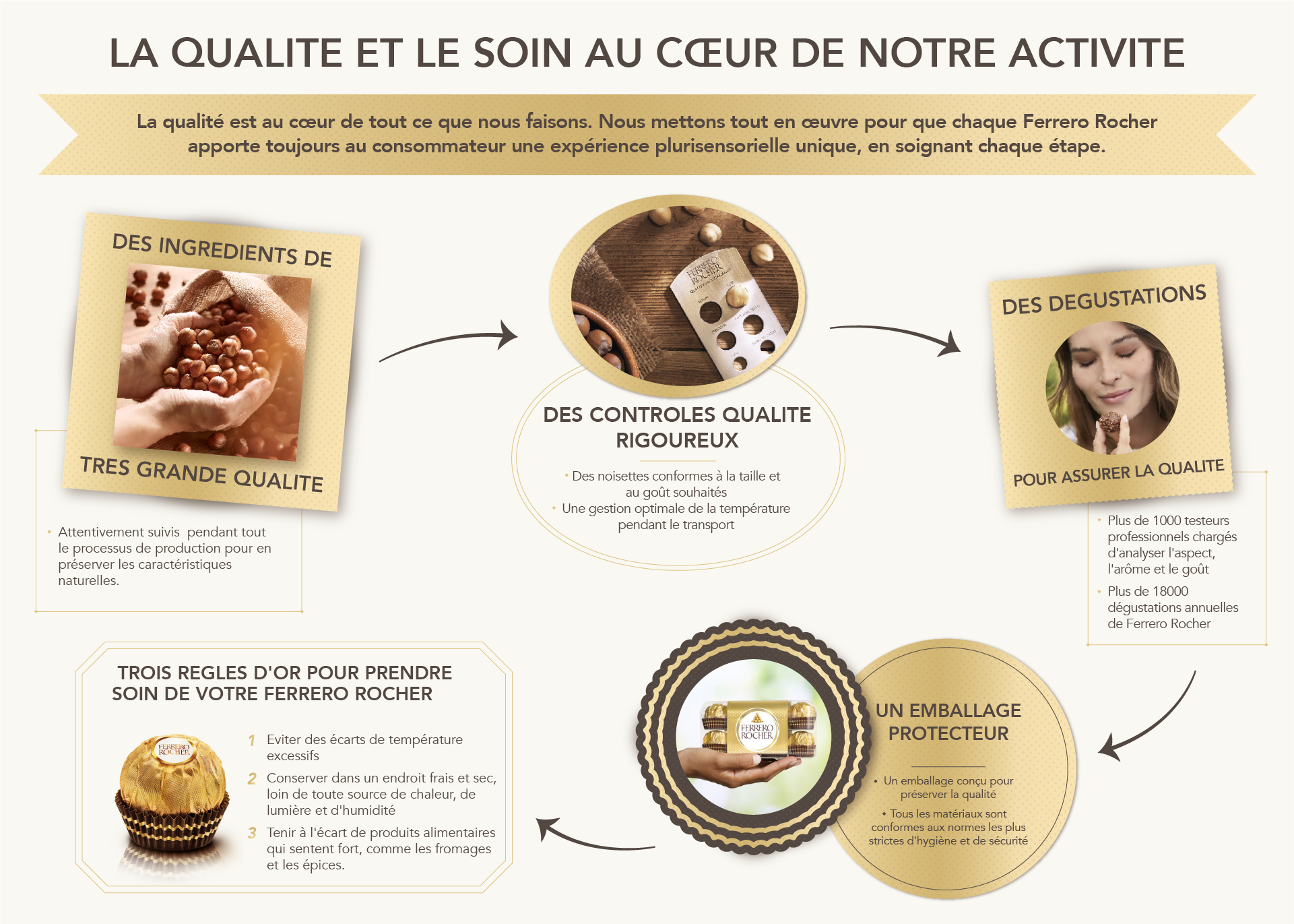 La qualité est une promesse que nous tenons avec chaque Ferrero Rocher, grâce au soin apporté à la fabrication, à l'emballage et au stockage de nos produits.