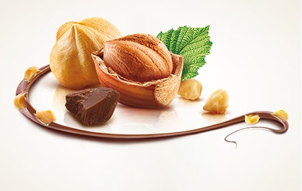 Une glace onctueuse au bon goût de noisette enrichie d’une délicieuse sauce à la noisette et au cacao.