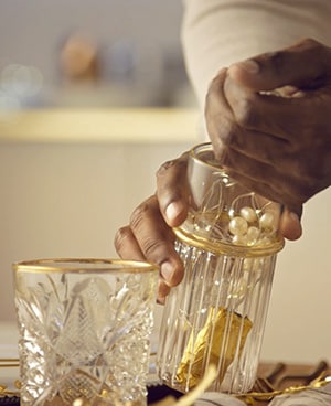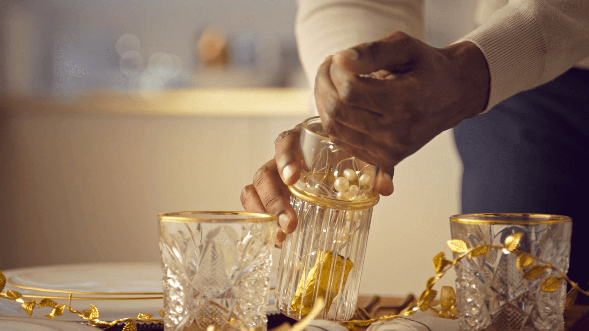 Remplissez les objets en verre avec des guirlandes lumineuses et des perles blanches.