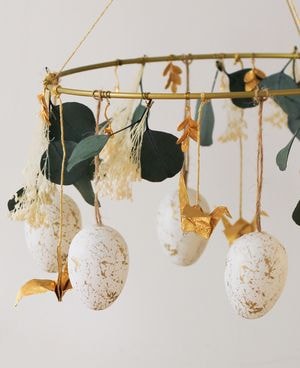 Entre chaque grue, fixez un œuf au cercle. - Ajoutez ensuite les breloques dorées et les végétaux à l'aide d'un petit morceau de fil de laiton en les répartissant de façon harmonieuse.