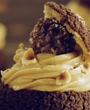• Déposez un Ferrero Rocher au centre de la pâte à choux, puis pochez la crème tout autour pour la recouvrir entièrement. Ajoutez un Ferrero Rocher au-dessus. C’est prêt !