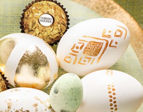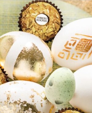 Hogy stílusos, szabálytalan mintákat kapjunk, gyengéden dörzsöljük át a tojásokat egy kefével. Rendezzük a kidíszített tojásokat, a kis dísztojásokat és a Ferrero Rocher szemeket egy nagy, lapos üvegtálra.