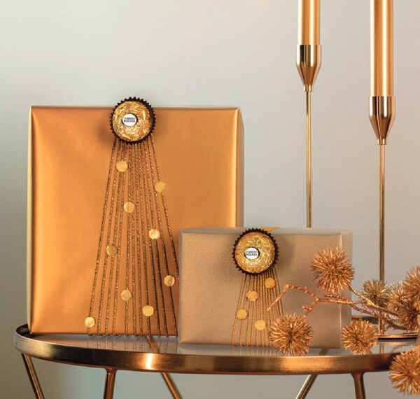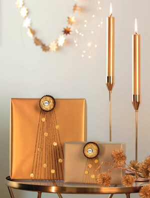Csomagoljuk be az ajándékot arany csomagolópapírba. Ragasszuk a csillogó fonal egyik végét az ajándékcsomag hátoldalára és tekerjük körbe a fonalat a csomag körül 10-12 alkalommal, méretétől függően. A fonal másik végét rögzítsük ragasztószalaggal a csomag hátuljára. A felső részen húzzuk össze a fonalakat, szorosan fogjuk le és ragasszunk rá kétoldalas ragasztószalagot és Ferrero Rocher pralinékat. A csomag alsó részén pedig húzzuk szét a fonalakat addig, amíg karácsonyfa alakot nem ölt. Tetszés szerint díszítsük a mini fát az arany matricákkal.