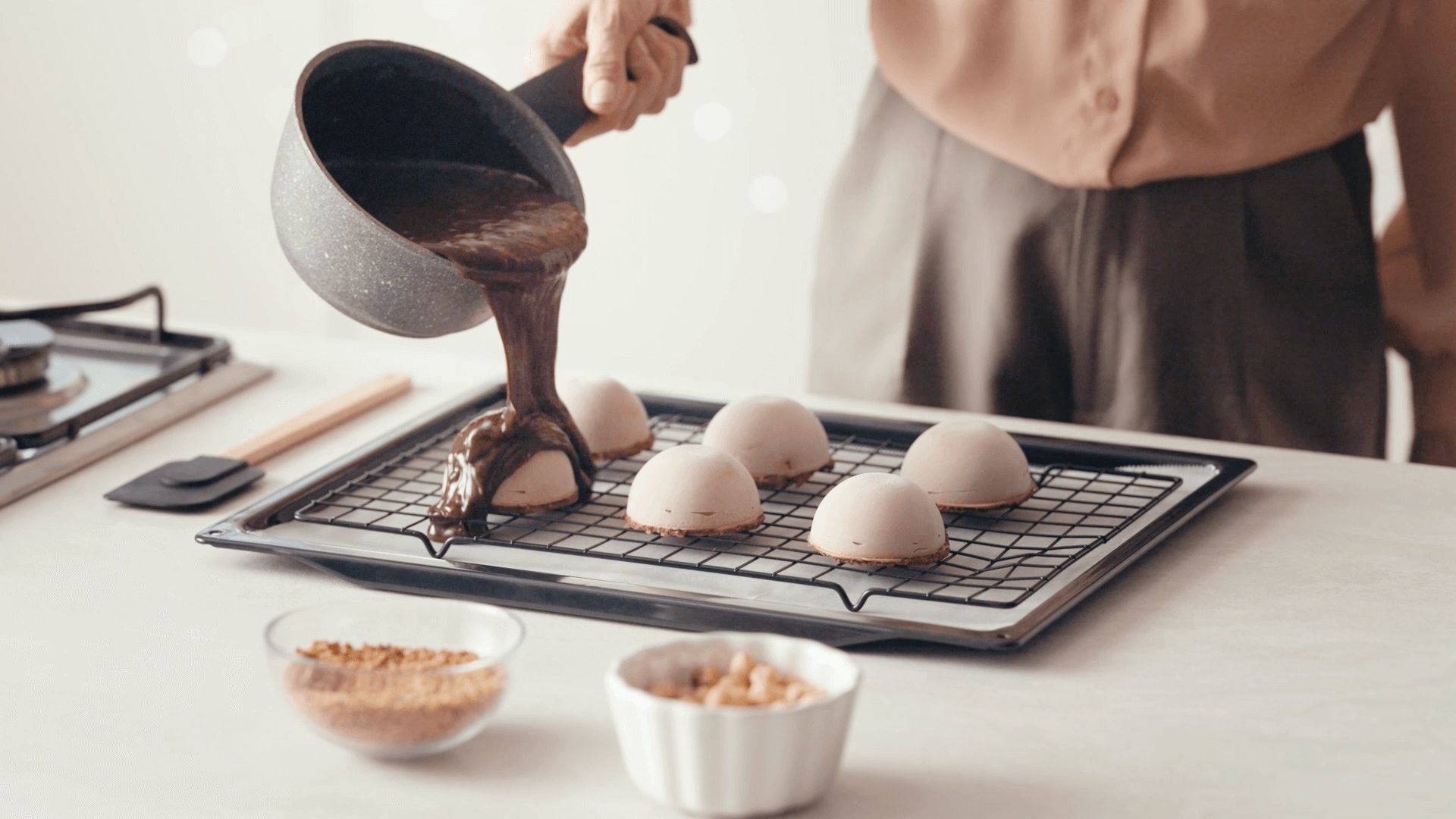 Óvatosan forgassa bele a mogyorót. A mázat körülbelül 45 °C-ra kell melegíteni, amikor a sütemények bevonására használja.