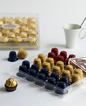 Once you've removed – or eaten – all the Ferrero Rocher, take out the inner packaging and place your espresso capsules in any order or design you wish. Voilà! A container for your capsules!