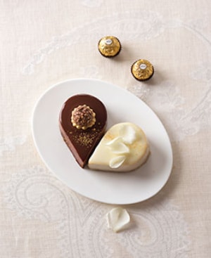 • Put in the fridge for 2 hours. Top off the larger drop with a Ferrero Rocher and gold powder. For the smaller drops decorate with untreated, white rose petals.