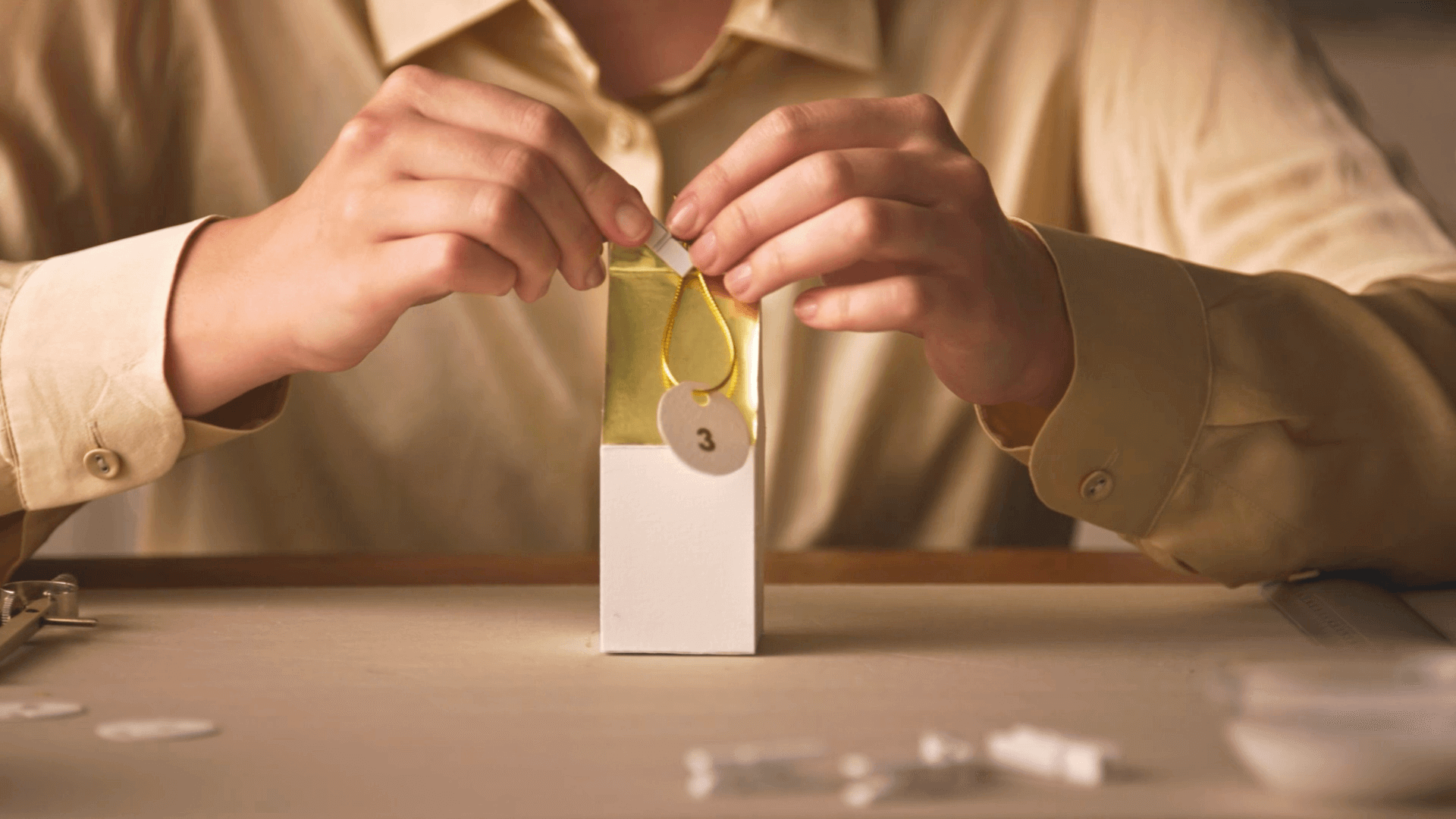 Ritaglia la carta adesiva dorata seguendo la forma rettangolare del tetto della casetta e applicala per aggiungere un tocco dorato.
