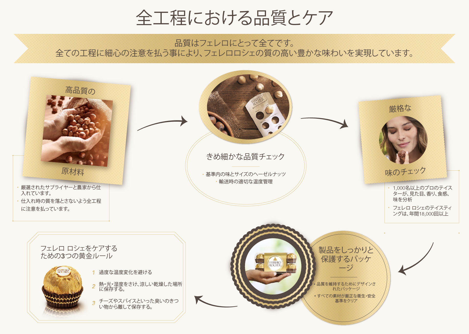 フェレロ ロシェの品質 融合する 専門知識と技能 厳密な専門知識と技能が完璧に調和した、その産物。フェレロでは、原材料からお客様がフェレロ ロシェを味わう体験に至るまで、品質管理と品質保証に関して細部まで行き届いた取り組みを構築しています。 こだわりをもって製造、包装、保管することにより、フェレロ ロシェ一粒一粒の品質をお約束しているのです。 ご覧ください より良いものへのこだわり 品質のための取り組み さらに見る さらに見る さまざまな感覚を刺激する体験 さらに見る さらに見る 品質を守るために さらに見る さらに見る 取扱いと保存 さらに見る さらに見る ご覧ください サステナビリティに関するコミットメント 詳しく見る