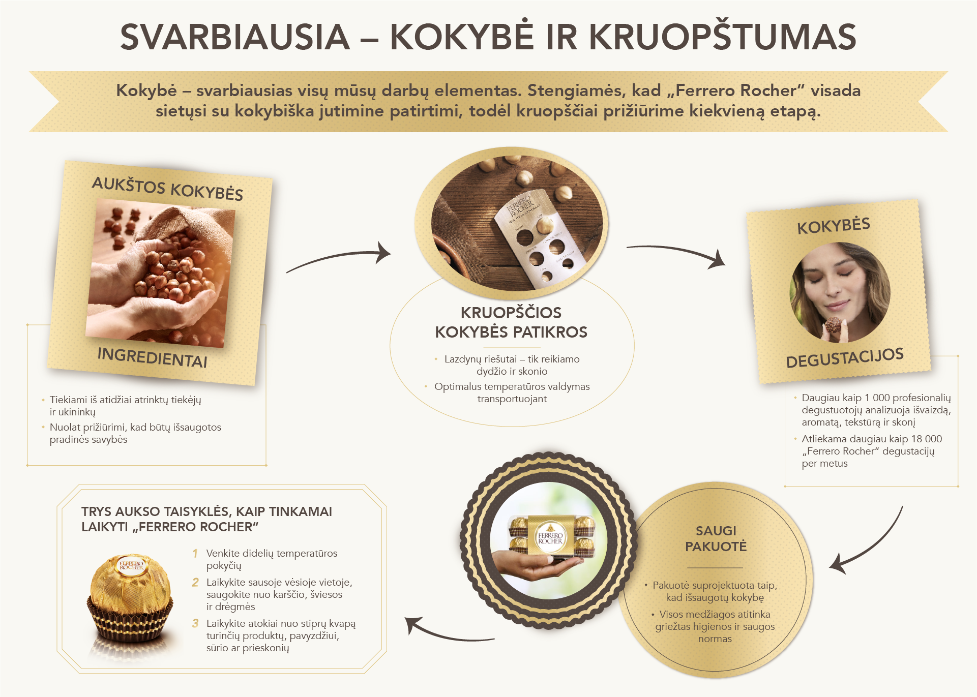Tai produktas, atspindintis puikų savo srities išmanymą ir meistriškumą. „Ferrero“ skrupulingai atlieka kokybės kontrolę, kad kiekvienas vartotojus pasiekiantis „Ferrero Rocher“ saldainis būtų nepriekaištingo skonio.