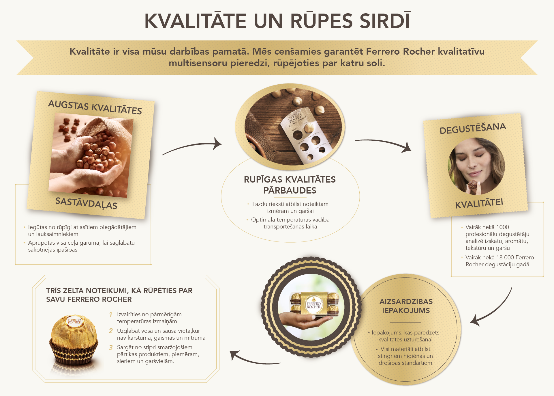 Kvalitāte ir solījums, ko mēs turam ar katru Ferrero Rocher, pateicoties rūpībai, ar kādu tie tiek izgatavoti, iepakoti un uzglabāti.