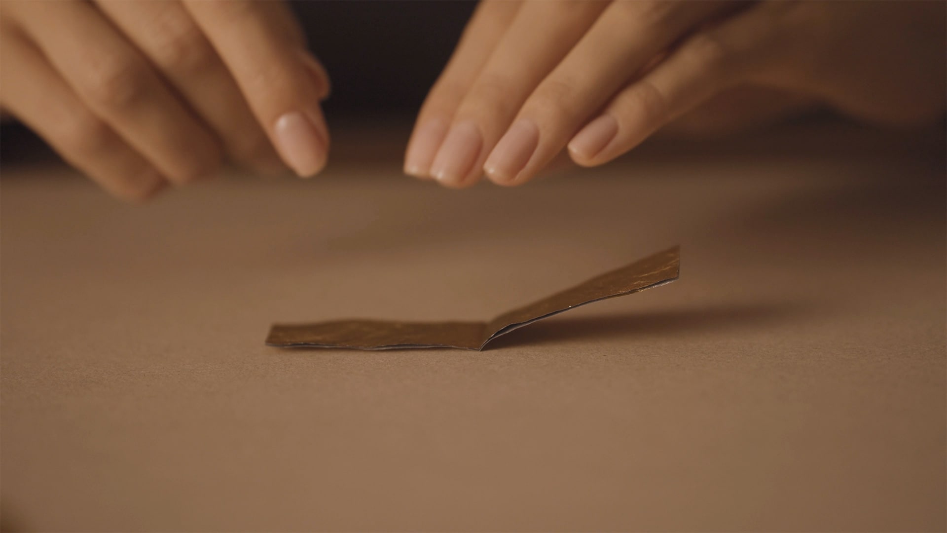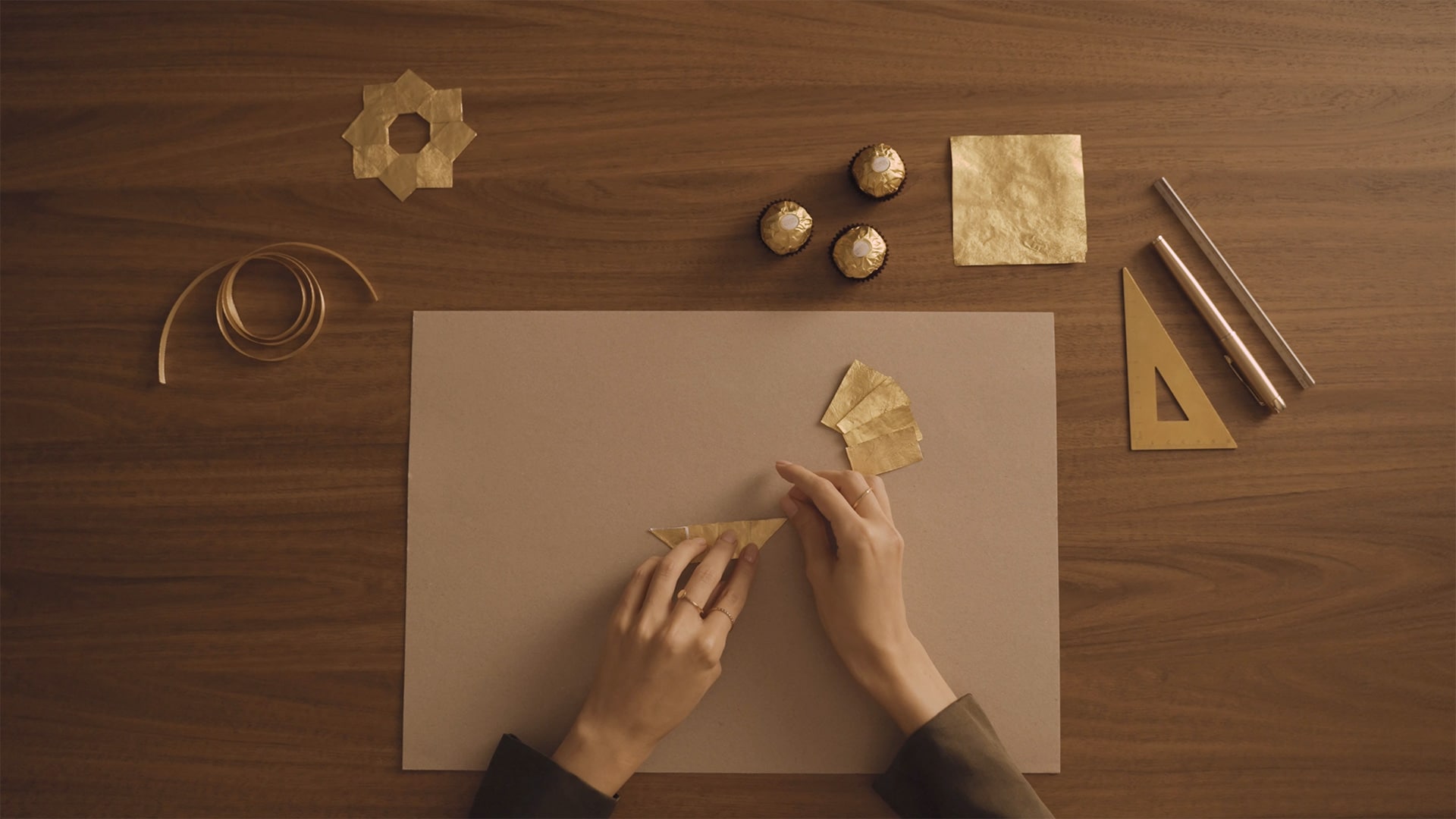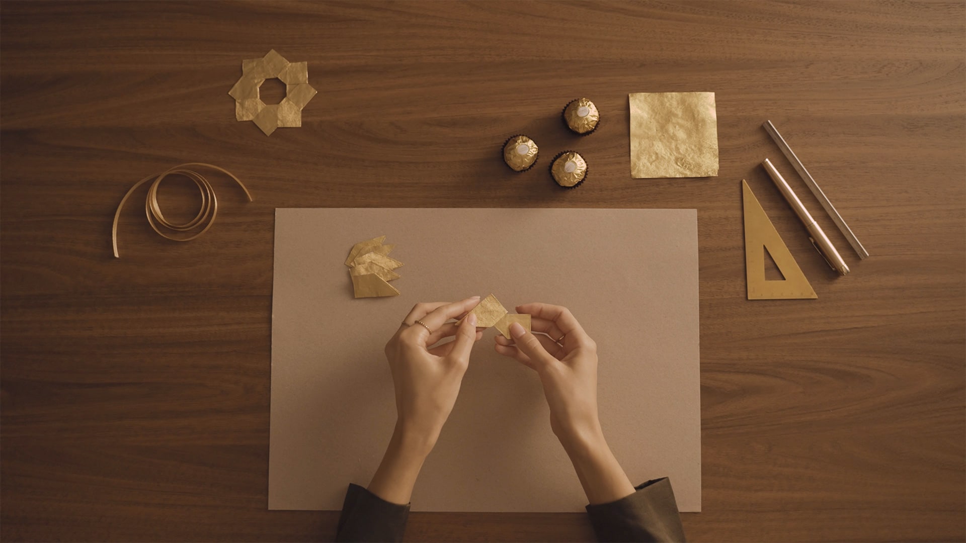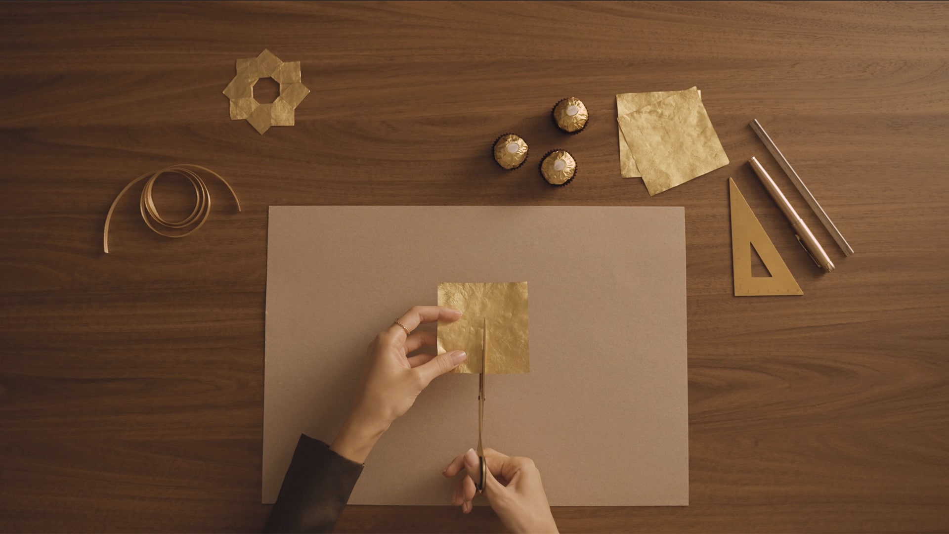 Sagrieziet katru zelta Ferrero Rocher foliju divās identiskās loksnēs.