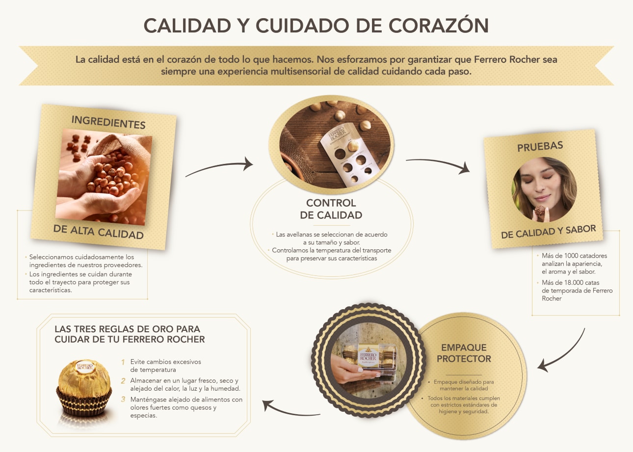 Un producto de rigurosa expertise y arte, trabajando en perfecta armonía. En Ferrero hemos desarrollado un enfoque meticuloso para el control y la garantía de calidad desde las materias primas hasta la experiencia de sabor de los consumidores de cada Ferrero Rocher.