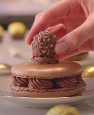 • Colocar una pequeña corona de ganache en la parte superior del macaron y encima un Ferrero Rocher.
