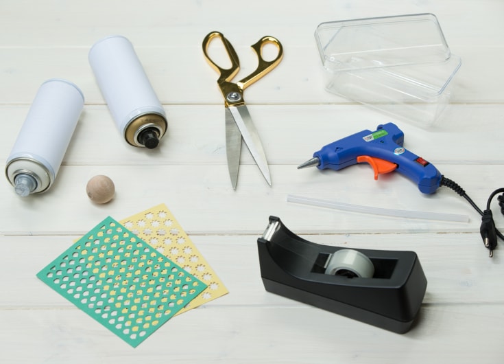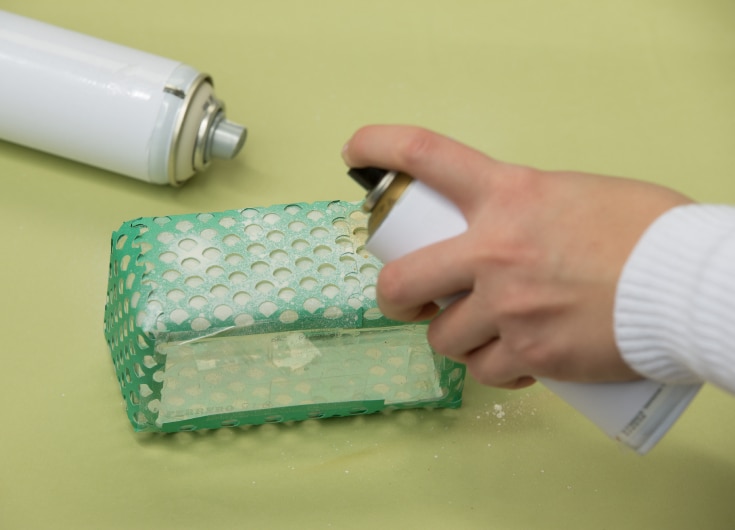 4. Besproei nu de beplakte doos met de witte en gouden verf. Ventileer de ruimte goed tijdens het spuiten! Laat je creatie goed drogen nadat deze helemaal naar wens is vormgegeven.