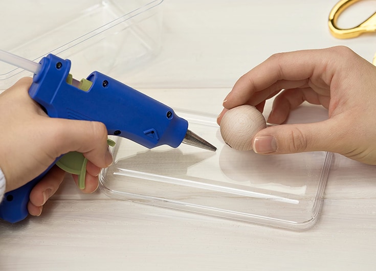 1. Maak eerst de Ferrero Rocher-doos leeg en verwijder voorzichtig de etiketten. Plak vervolgens het gekozen figuur met het hetelijmpistool op het deksel en laat de lijm ca. 10 minuten goed uitharden.