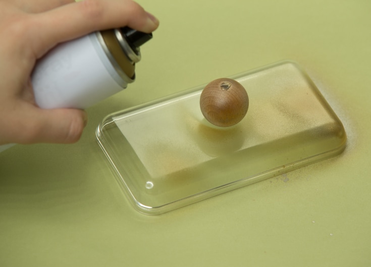 2. Besproei nu het deksel en het figuur met de gouden spuitverf. Laat de verf goed drogen; hoelang dit duurt kan variëren, maar wij raden aan 30 minuten te wachten.