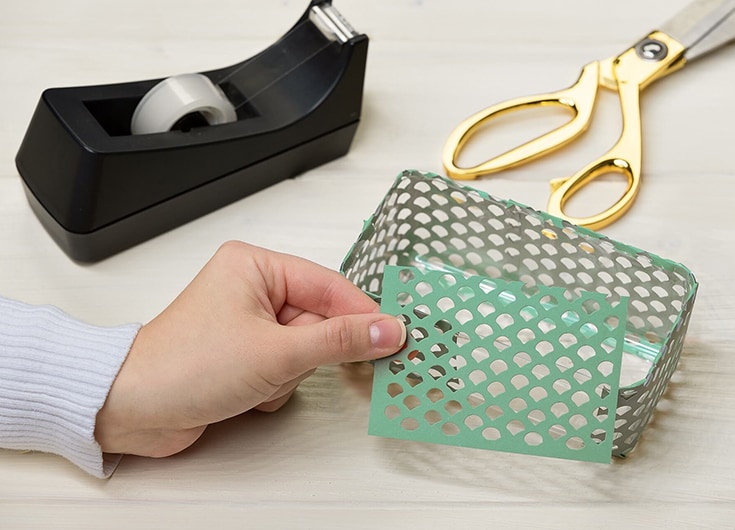 3. Terwijl het deksel droogt, kun je het onderste deel van de doos beplakken met het sjabloon en de plakband. Je kunt daarbij je creativiteit de vrije loop laten en zelfs een aantal van je lievelingspatronen combineren. Zorg ervoor dat het hele onderste deel van de doos goed is beplakt, zodat er geen randen zichtbaar zijn in het eindresultaat.