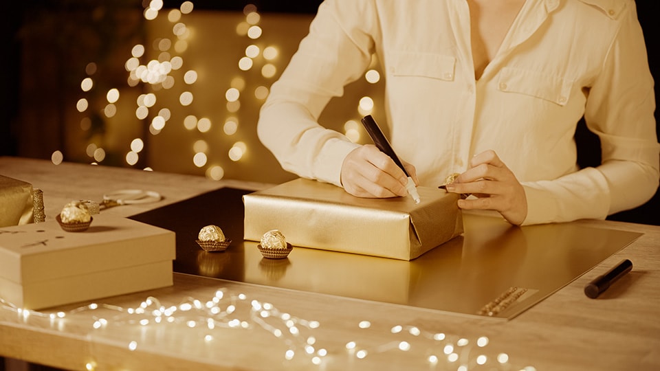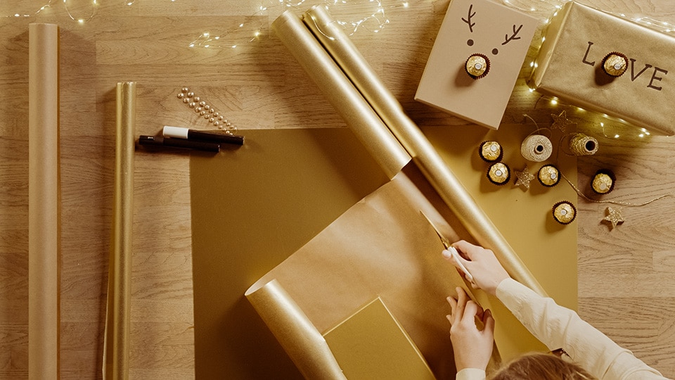 Wikkel je cadeau in elegant natuurlijk bruin of goudkleurig cadeaupapier.