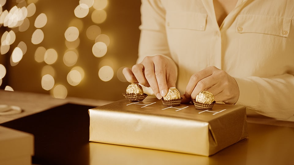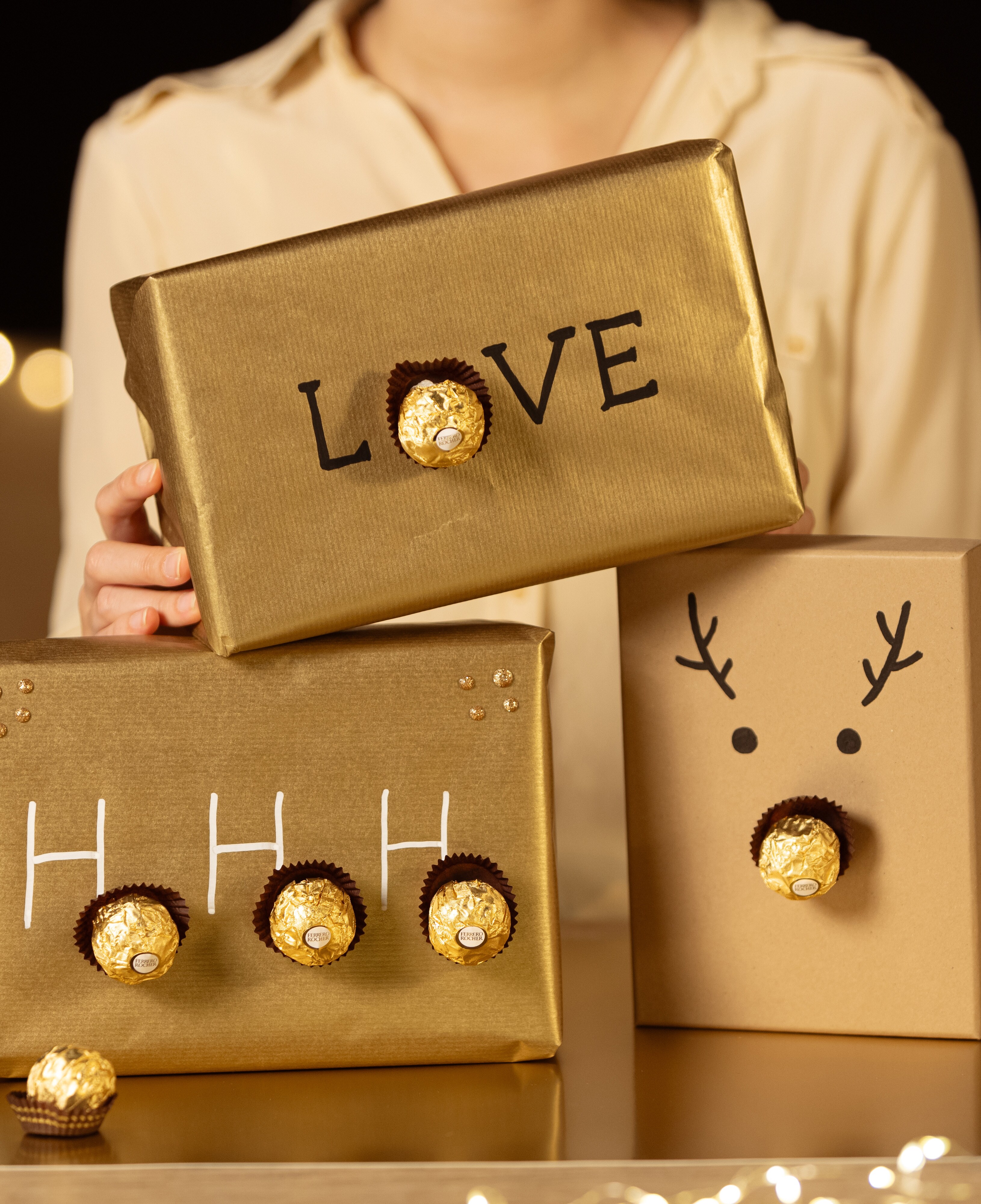 Breng knutsellijm of plakband aan op de onderkant van de Ferrero Rocher en plak ze op het cadeau.