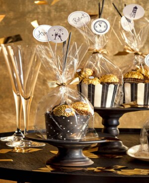 - Schrijf de namen van de gasten op de etiketten en steek de stokjes, samen met de sterretjes, in de cupcake vormpjes.