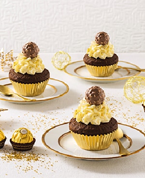 Klop de double cream met een elektrische mixer, meng het met de sinaasappelmarmelade, doe het in een spuitzak met een stervormige spuitmond en spuit het op de cupcakes. Besprenkel met goudpoeder en rond af met één Ferrero Rocher per portie.