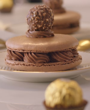 • Spuit op de bovenkant een dotje ganache en plaats er een Ferrero Rocher op.